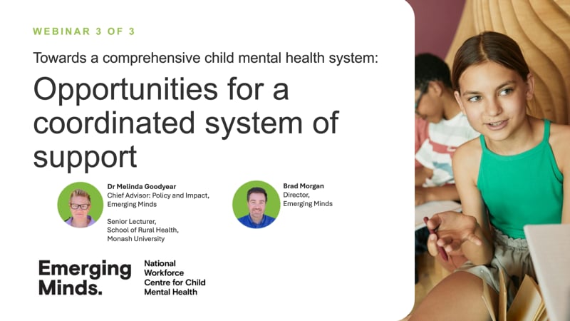 This webinar considers the scope for systems to improve mental health support for children and their families across the spectrum of services. Emerging Minds team members discuss their work on a competency framework to support development of child mental health professionals, in alignment with the organisation’s vision for a comprehensive child mental health system. The team also explore the role that sectors and organisations can play in bringing this vision to fruition for the wellbeing of children and families.
